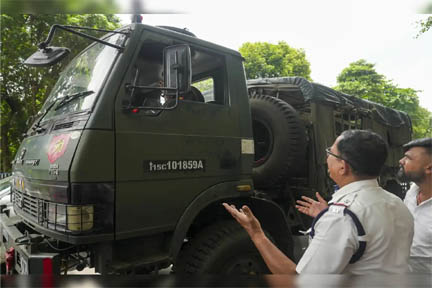 कोलकाता. सेना द्वारा भारतीय जनता पार्टी (भाजपा)-शासित राज्यों में बांग्लाभाषी प्रवासी श्रमिकों पर कथित अत्याचार के खिलाफ तृणमूल कांग्रेस द्वारा बनाए गए मंच को गिरा दिए जाने के एक दिन बाद कोलकाता पुलिस ने मंगलवार को लापरवाही से वाहन चलाने के आरोप में सेना के एक ट्रक को रोक लिया. ट्रक चला रहे सैन्यकर्मी के खिलाफ खतरनाक तरीके से वाहन चलाने का मामला दर्ज किया गया. पुलिस के एक वरिष्ठ अधिकारी ने बताया कि यह घटना पूर्वाह्न करीब 11 बजे राइटर्स बिल्डिंग के सामने हुई.
